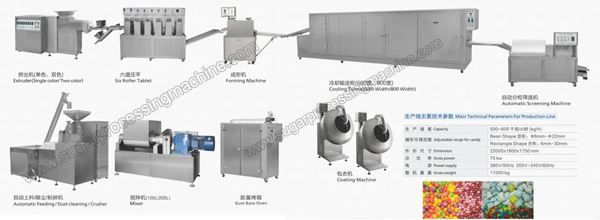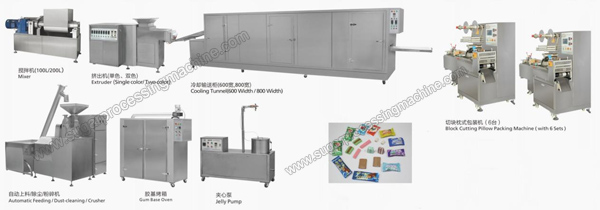 Raw material dissolving Transporting->Storage->Dosing—Preheating —Micro-film cooking Discharging -> Mixing with flavor and color -> Depositing -> Cooling — Demoulding — Conveying->Packing