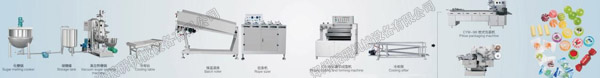 Sugar melting cooker-Storage tank-Vacuum sugar cooking machine-Cooling table-Batch roller-Rope sizer-Rotary cutting and forming machine-Cooling sifter-packaging machine